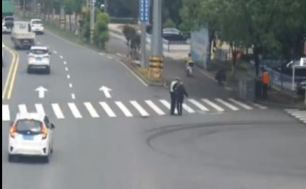 近日,一名拄著拐杖的老人緩慢地在路邊行走,逐漸陷入車流之中。