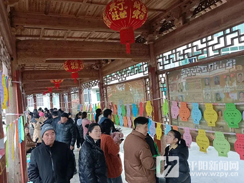 在橋西村上垟活動現場,廊橋里懸掛著許多燈籠形狀的紙片,紙片上分別帶有二十大熱詞、時政熱詞、名著人名等趣味謎語,猜謎的群眾有的三兩成群討論,有的翻找資料,大家興致勃勃、歡欣踴躍,猜出正確答案的群眾在兌換獎品的工作臺前排起了長長的隊伍,現場井然有序。