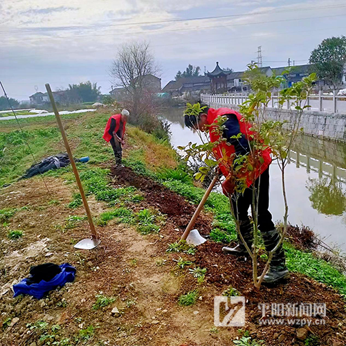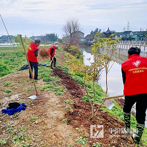 植樹現場,黨員志愿者們熱情高漲,干勁十足,揮鍬鏟土、扶苗填坑、踏土固根、圍根澆水……各個環節銜接有序,配合默契,以實際行動為黎明村增添一片綠色和春意。一棵棵四季桂帶著滿滿的愛與希望穩穩扎根在斜港河沿岸,錯落有致,煥發出盎然生機。