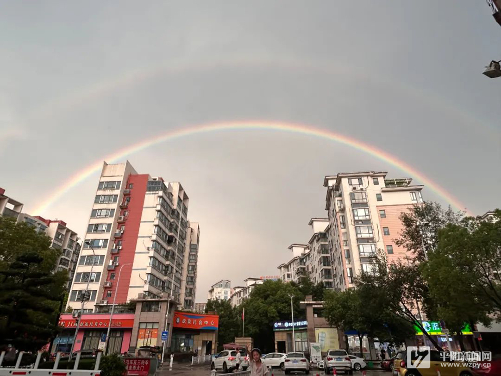 此時,我縣多地上空出現了一道絕美的雙彩虹,夕陽與彩虹相映成趣,引來群眾紛紛駐足欣賞、拍照。 本網記者 陳亮 攝 編輯 周啟來