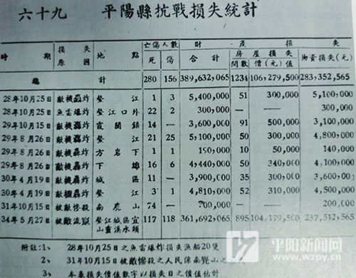 平陽(yáng)縣抗戰(zhàn)損失統(tǒng)計(jì)表