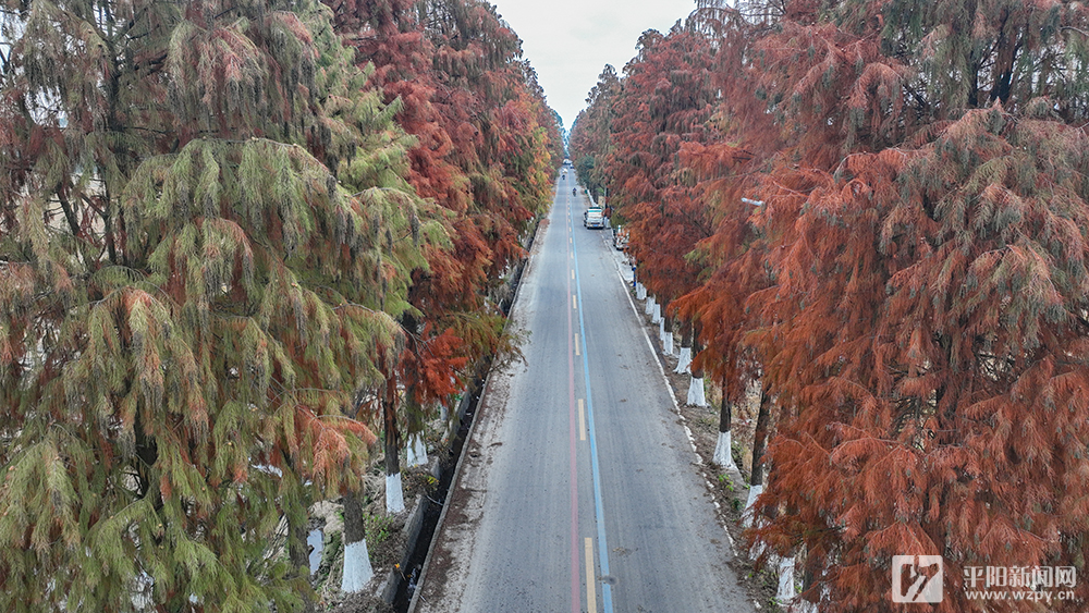 航拍鏡頭下水杉由翠綠到淺黃到深紅,與道路、房屋交相輝映,美景吸引了游客和攝影愛好者駐足觀賞。 本網(wǎng)記者 林鑫 攝 編輯 周啟來