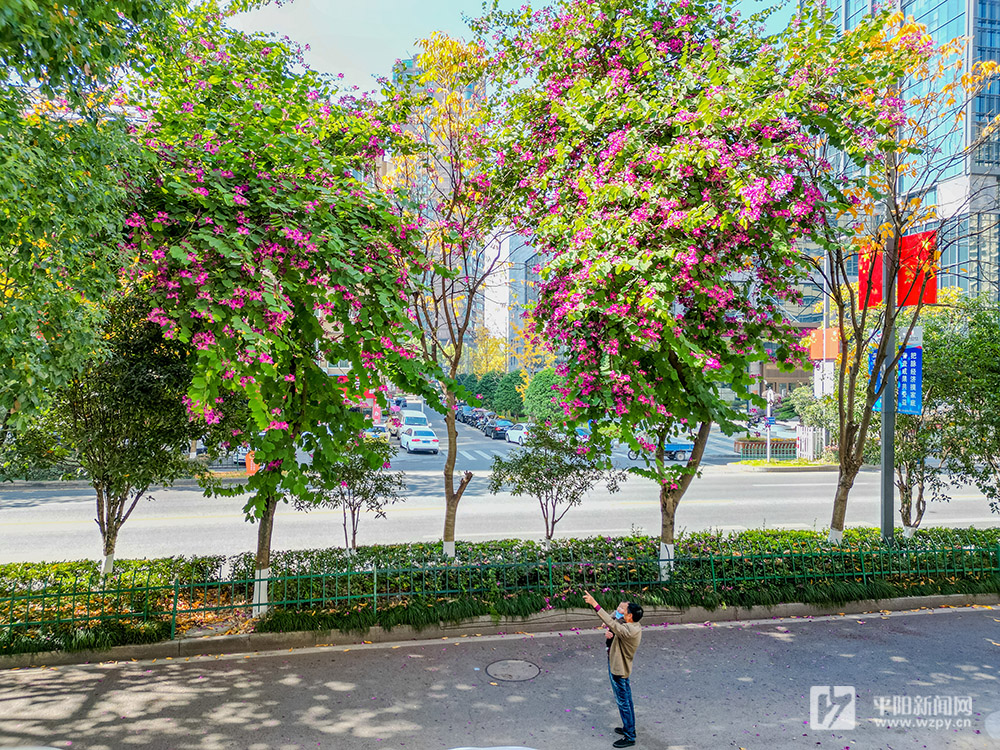 近日,在鰲江鎮車站大道兩旁,紫荊花迎風盛開,密密層層,滿樹嫣紅,成了冬日里一道靚麗的風景。