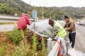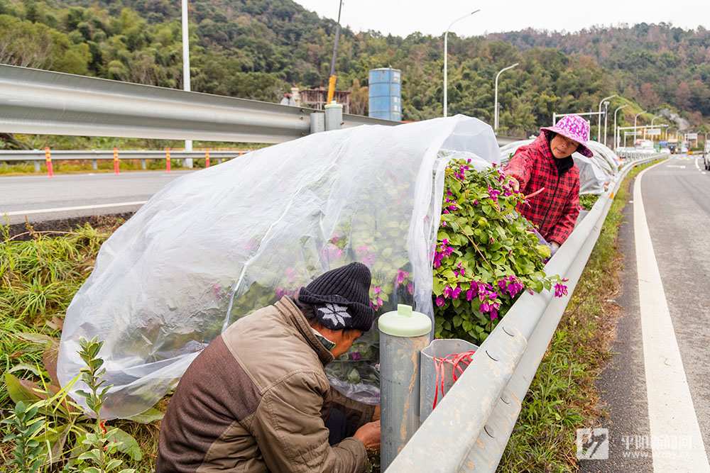 近日,鰲江鎮組織園林綠化工人,為104國道西過境鰲江段公路沿線綠化帶內不耐寒的綠植覆蓋薄膜。