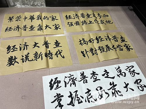 活動現場,書畫愛好者研墨鋪紙、伏案創作,一幅幅“經濟大普查數說新時代”“經濟普查靠摸家底利國利民利自己”等經普宣傳標語躍然紙上。