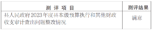 2024年11月28日平陽縣第十七屆人民代表大會常務(wù)委員會第二十次會議聽取和審議了縣人民政府關(guān)于2023年度縣本級預(yù)算執(zhí)行和其他財政收支審計查出問題整改情況的報告,并進行了滿意度測評。現(xiàn)將測評結(jié)果公告如下: