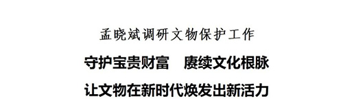 調研中,孟曉斌實地察看文物保護現狀,詳細了解文物的歷史背景、保護措施及存在困難。他指出,文物是不可再生的珍貴文化資源,是歷史的見證者,做好文物保護工作責任重大、意義深遠。各有關鄉鎮、部門要切實提高政治站位,增強文物保護的責任感和使命感,把文物保護工作擺在突出位置,加強協作,形成合力,全面提升文物保護、管理和利用水平。